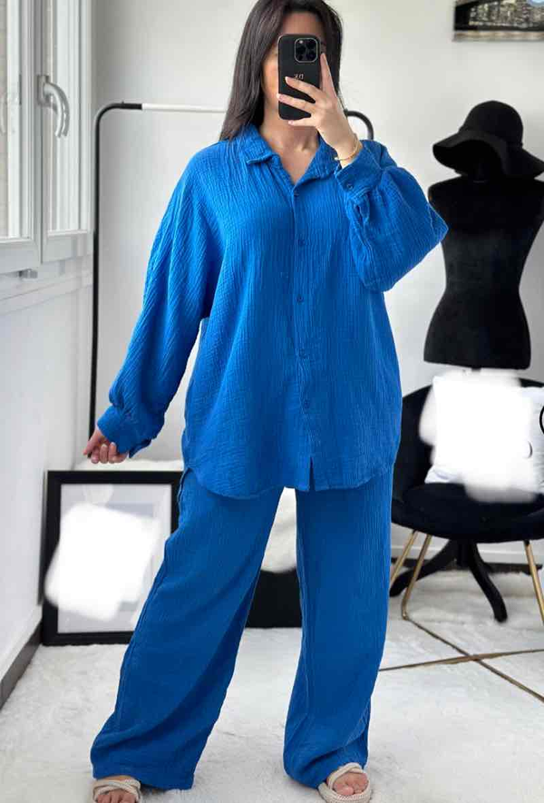 Comfy twinset bestaat uit een wijde broek en een blouse.